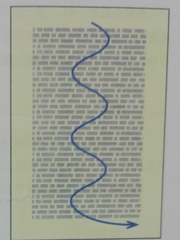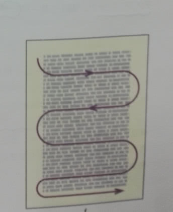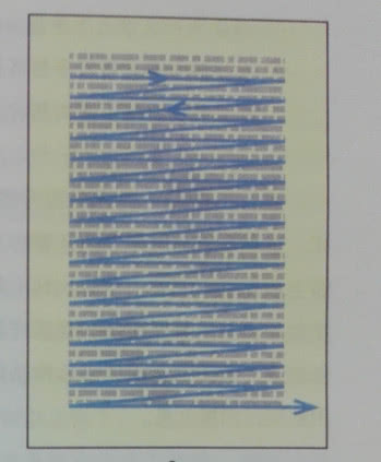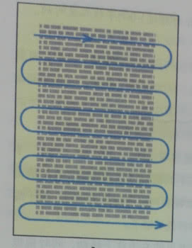 垂直波形技巧常常使无知者相信快速阅读者能在书页上沿着一条直线向下阅读。事实上,他们的眼睛是有节奏地呈波状滑行,轻微地 左右移动,沿着书页的中间部分往下移动。