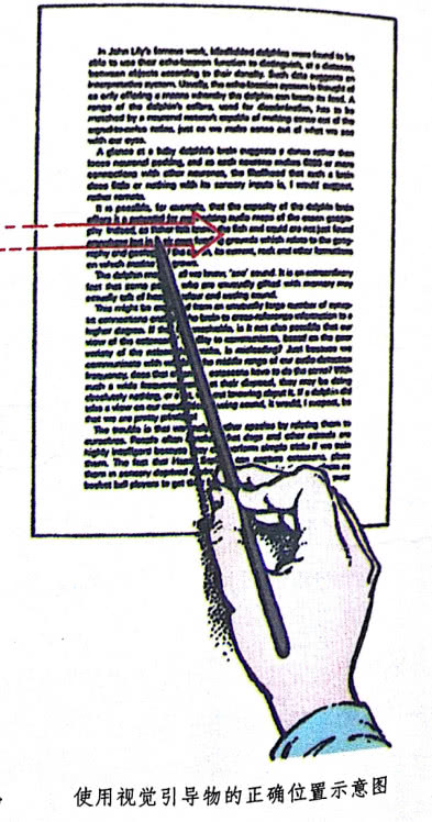 双边引导技巧使用两个引导物,常常使一根手指在一边,而标准引导物在另一边,两边一致平滑地沿页边缘向下移动。同时,你的眼睛大量地吸收着两者之间的信息。