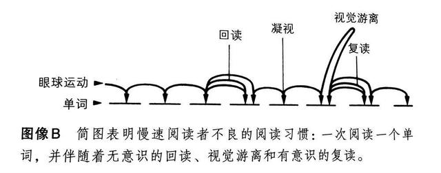 B图像表明的是不良阅读习惯下的眼球运动轨迹图。此阅读者停顿或凝视单词的时间和大多数人一样长。但阅读者一次阅读一个单词,并伴随着无意识的回读、视觉游离和有意识的复读,使得阅读速度和理解效率低下。逍遥右脑快速阅读研究表明:当阅读者不允许回读或复读时,在80%的案例中,他们能掌握所有必要的信息。